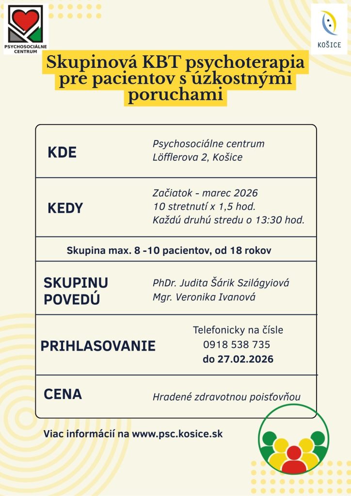Psychosociálne centrum Košice, Löfflerova 2, Košice otvára od marca 2026 novú skupinovú kognitívno-behaviorálnu terapiu (KBT) zameranú na liečbu úzkostných porúch. Skupina je určená pre dospelých pacientov s úzkostnými poruchami, ktorí majú záujem pracovať na porozumení svojej úzkosti, osvojovaní si zvládacích stratégií a postupnej zmene nefunkčných vzorcov myslenia a správania v bezpečnom skupinovom prostredí.